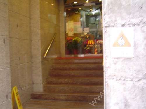 連接汽車路旁行人路,通道是寬闊的住宅正門,前臨梯級及一級台階障礙,無斜道輔助,無觸覺引路徑,門是玻璃對開推門.