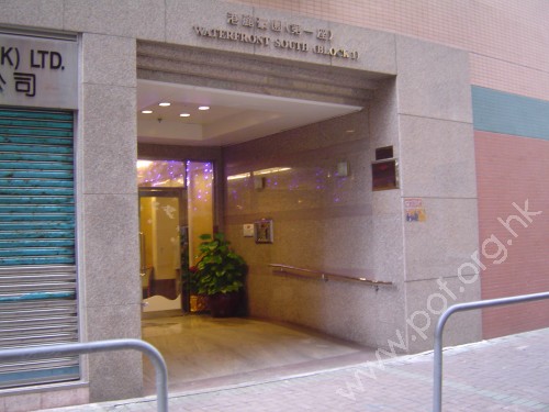連接汽車路旁行人路,通道是寬闊無障礙的住宅正門,正門前設有斜道連接行人路,無觸覺引路徑,門是不綉鋼框玻璃對開推門.