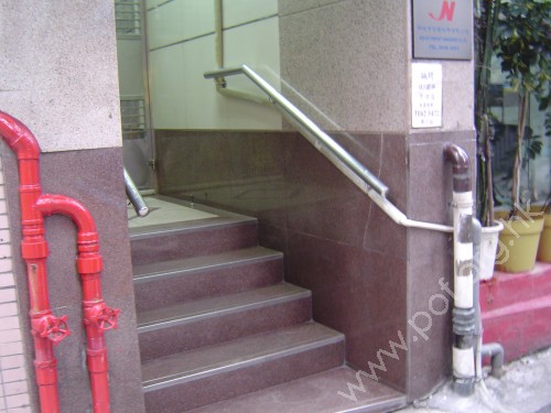 連接住宅正門閘門與汽車路旁行人路高低位置,共有四級梯級,頂底兩端無觸覺警告帶,兩邊設有扶手,固定在兩邊牆壁上,牆壁棕色淺棕色無凸出物,踏板棕色.