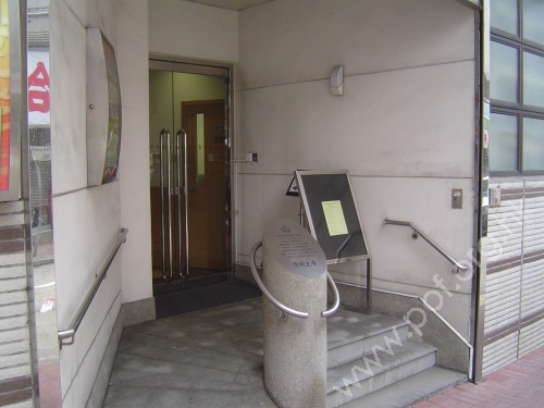 連接汽車斜路旁行人斜路,通道是寬闊的服務中心出入口,前臨兩級梯級障礙,無斜道輔助,無觸覺引路徑,門是玻璃對開推門.