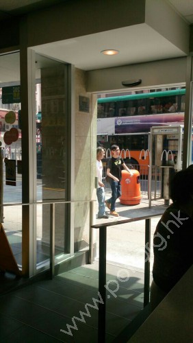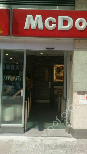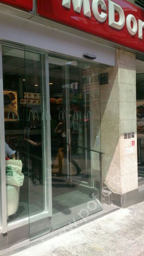 連接汽車路旁行人斜路,通道是餐廳正門,分左右兩度門,前臨兩級梯級障礙,經本會投訴爭取後,一邊門改設固定斜道,及使用自動門;無觸覺引路帶;自動門是寬闊的單邊玻璃自動門。