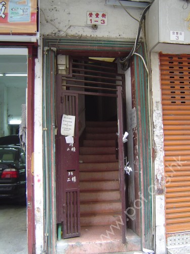 連接汽車路旁行人路,通道是夠闊的住宅正門門廊,連接一扇閘門闊度的住宅正門閘門,有一級台階障礙,進入後是梯級,無斜道輔助,無觸覺引路徑,閘門是棕紅色金屬框單邊閘門.