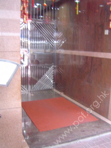 連接汽車路旁行人路,通道是寬闊的住宅正門閘門,有一級台階障礙,無斜道輔助,無觸覺引路徑,閘門是不綉鋼面框對開閘門.
