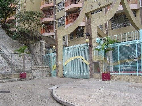 連接汽車路,通道是寬闊平坦無障礙的汽車出入口閘門,毗連行人出入口閘門,往來院舍建築物,旁行人路無觸覺引路徑,閘門是青綠色金屬框大閘門.