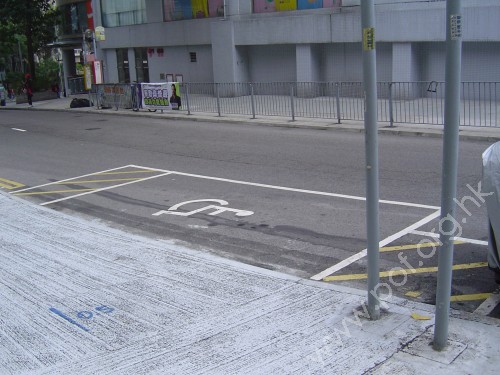 是露天汽車路邊泊車位,只有一個泊車位,前後端設有白色框黃影斜線,旁設下斜路緣連接行人斜路,車位面積與一般停車位相同,地面上髹有白色國際暢通易達標誌以資識別,旁設有指示牌說明.