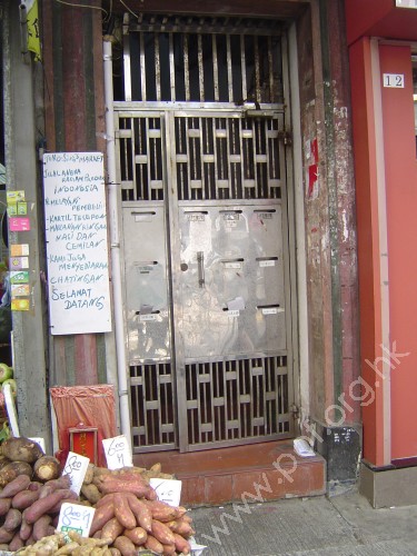 連接汽車路旁行人路,通道是寬闊的住宅正門門廊,連接一扇閘門闊度的住宅正門閘門,有一級台階障礙,無斜道輔助,無觸覺引路徑,閘門是金屬框單邊閘門.