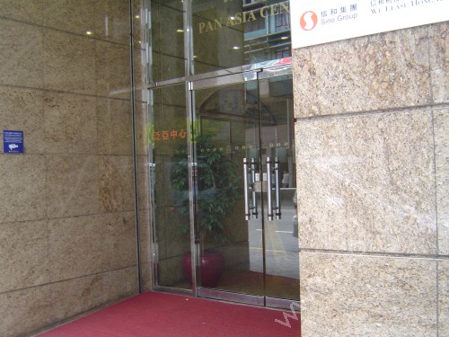 通道是寬闊無障礙的商廈正門,前臨微斜斜道連接行人路,無觸覺引路徑,門是對開玻璃推門。