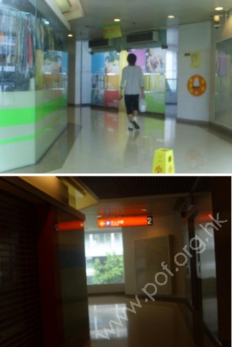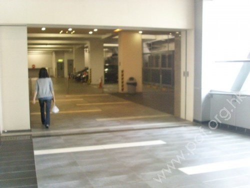是廣場通往停車場行人天橋通道,寬闊平坦,盡頭設有兩扇對開玻璃門,無觸覺引路帶。