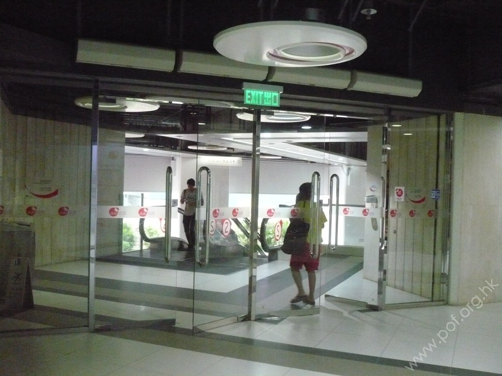 連接往來地面的梯級與自動電梯,通道是寬闊的商場2樓正門,往來商場2樓層;無觸覺引路帶;門是對開玻璃門,共有兩度玻璃門並排。