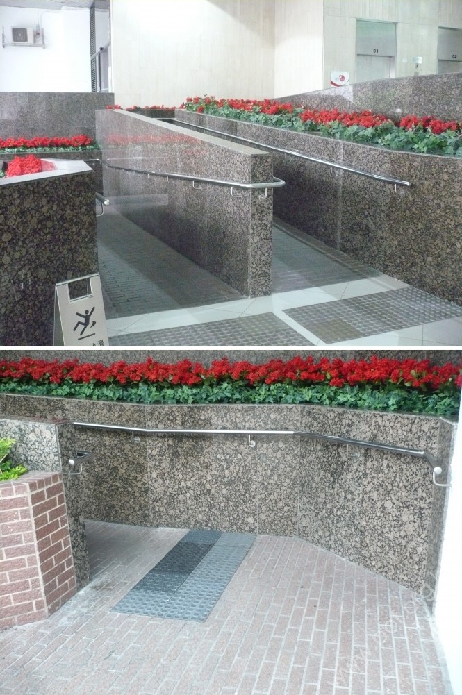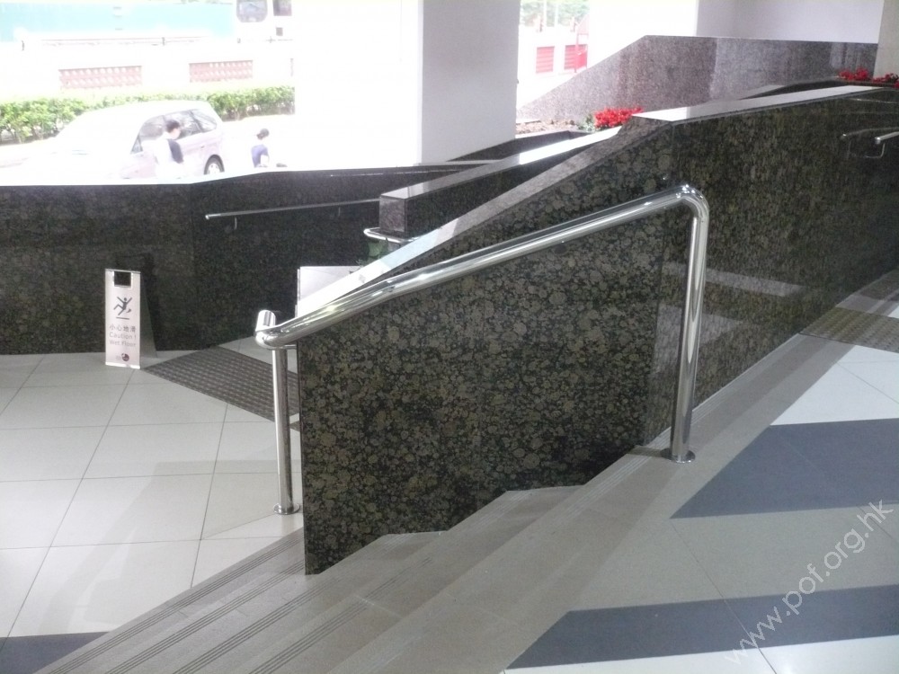 是管狀金屬扶手,高0.85米、直徑闊40毫米,兩邊固定在矮牆上;頂底兩端有平行地面伸延設計,無觸覺點字或凸字資料標誌。