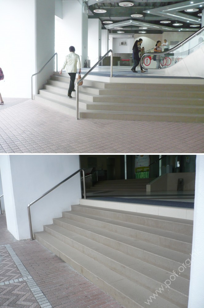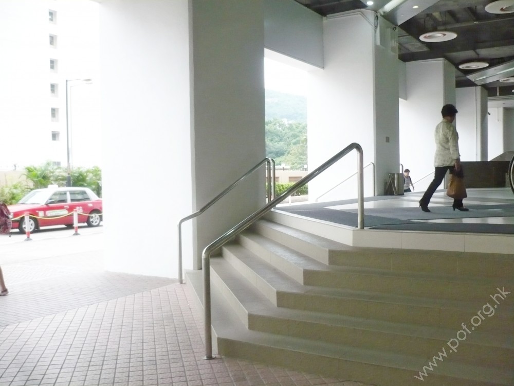 位置 : 位於面向樂景街方向的斜道與梯級通道,梯級頂部地面1樓往來2樓商場正門的梯級。