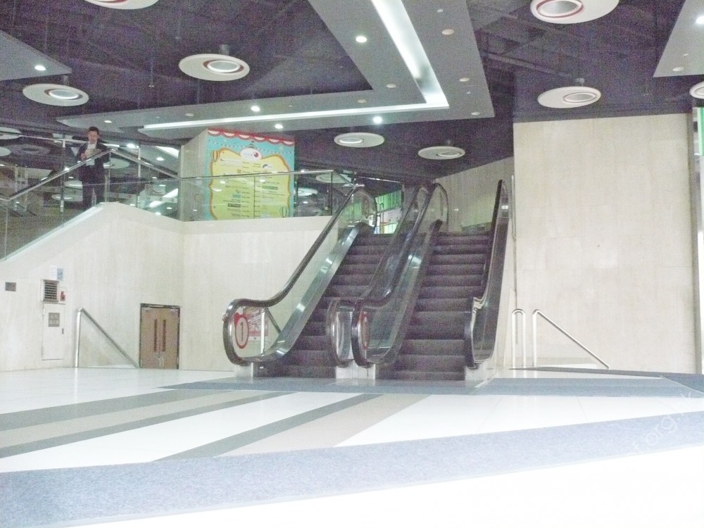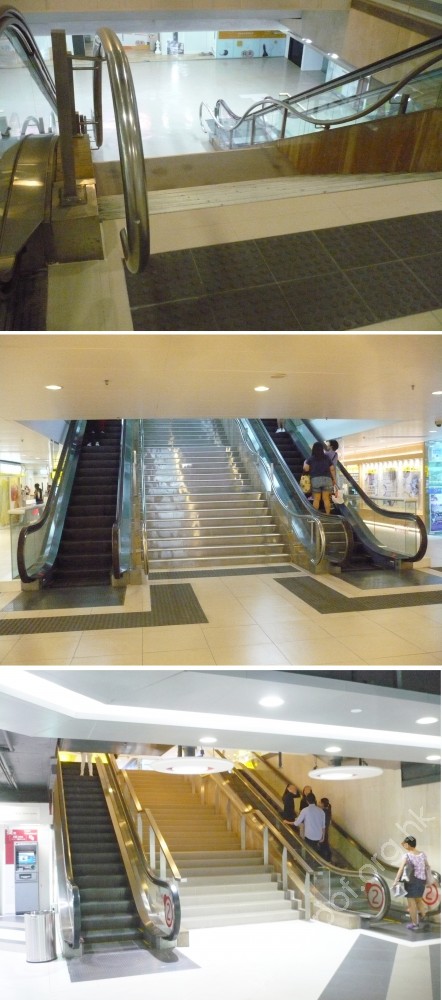 連接面向樂景街方向的斜道與梯級通道、梯級頂部的地面1樓平台,與商場2樓正門前平台,共有兩條自動電梯、上落各一條並排;頂底兩端無觸覺警告帶;無表示移動方向的標誌或指示訊號。