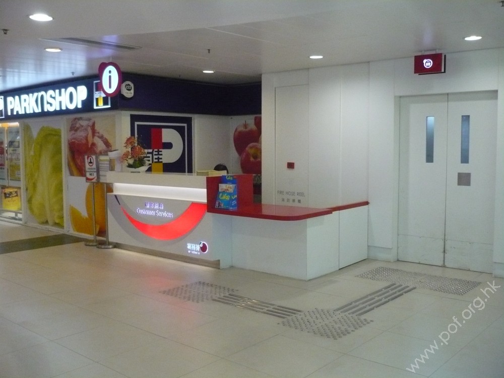 商場3樓C1及C2升降機之間的召喚升降機按鈕、前設有金屬色的觸覺引路帶,沿升降機大堂向前伸延,轉向至往來商場的對開防火門,對應防火門後同色的觸覺引路帶,伸延轉向至設於商場3樓的顧客服務櫃檯。