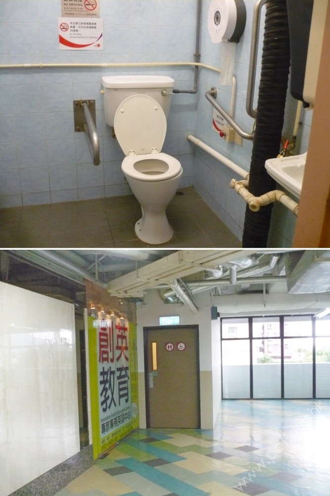 是無分性別洗手間,無觸覺引路帶連接;前往洗手間經過一度防火門、打開後的淨空間闊0.95米;門上有紅色輪椅標誌、無觸覺點字標誌,只門內有扶手,門打開後的淨空間闊0.75米,門鎖是緊急時可以從外面開關;洗手間面積夠闊,座廁有坐蓋可作背靠、沖水掣位於牆角;洗手盆底有淨空間,水龍頭是槓桿式開關;設有L扶手,摺合扶手無使用說明,緊急叫喚鐘顯示器位於門外旁,按鈕高0.65米,設有告示。