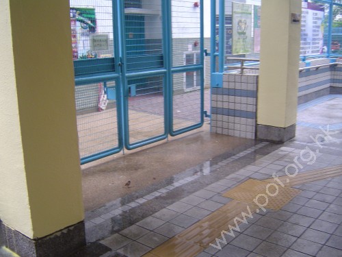 連接橫過屋邨的有蓋行人通道,通道是寬闊平坦無障礙的學校出入口閘門,往來校院建築物,閘門前有蓋行人路設有黃色觸覺引路徑,橫過閘門但不連接,閘門是藍色金屬框鐵絲網對開閘門.