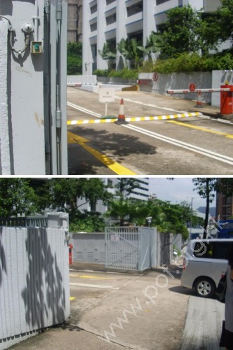 寬闊雙線車輛通道,入口設有兩扇灰色鐵閘,閘內兩邊各設有一條收放欄杆,底部有拱起路障,無觸覺引路帶。
