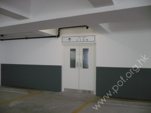 通道連接LG層、停車場地面層至1樓、與3至4樓,對面是停車場2樓出入口,通道是平坦無障礙的升降機,只有一部,門闊0.85米,門旁無暢通易逹標誌,門前無觸覺引路徑。