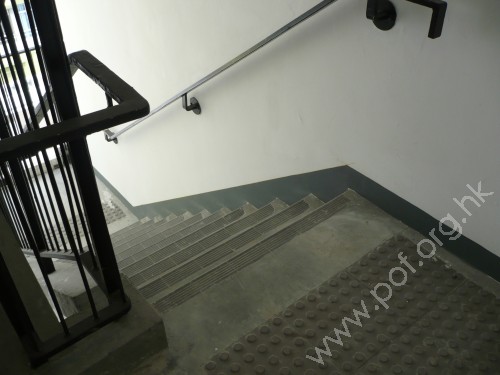 共有四級踏板,頂底兩端設有黑色觸覺警告帶,兩邊設有扶手,一邊固定在矮牆頂欄杆上,旁無牆壁;另一邊固定在白色牆壁上,牆壁有警鐘按鈕凸出,踏板淺灰色。