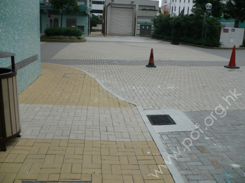 下斜路緣連接緊急車輛通道與住宅翼前屋邨行人路,位於兩者之間,面積夠闊,斜度略高,斜面無觸覺警告帶,頂端是住宅翼前屋邨行人路,是行人路保留面積,視野開揚。