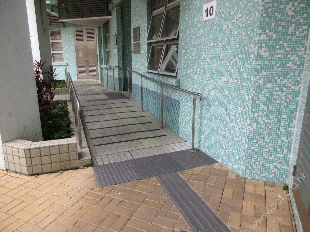 斜道連接正門與屋邨行人路高低位置,斜道是左右兩邊均可出入,寬闊,斜度適中,兩邊設有扶手,頂底兩端設有觸覺警告帶。