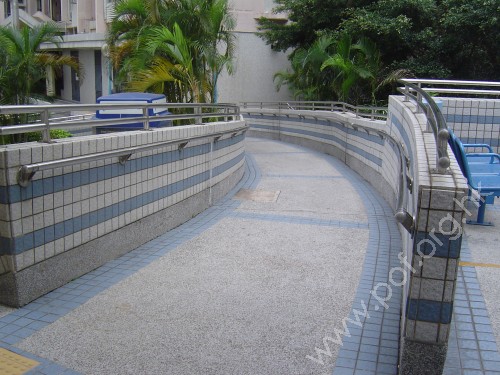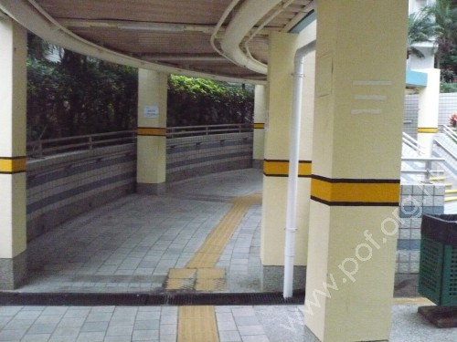 連接住宅正門閘門與屋邨行人長廊,通道是寬闊的有蓋斜路,斜度一般,頂底兩端無觸覺警告帶,兩邊設有扶手,固定在兩邊花槽矮牆上,矮牆頂是欄杆.