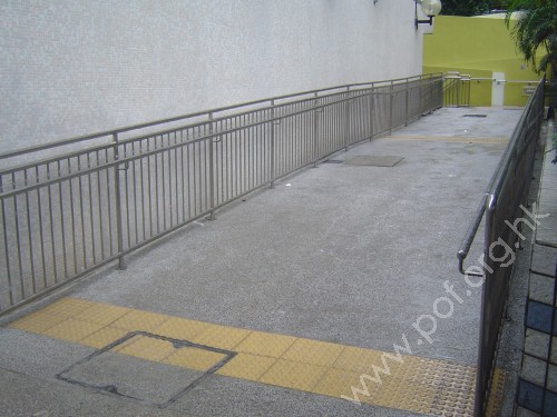 連接田康樓前行人路與田康樓前圓型廣場行人路,斜道寬闊,斜度一般,分成兩段直角轉向,頂底兩端及平面無觸覺警告帶,上段一邊設有扶手,另一邊是不銹鋼欄杆,底段兩邊設有扶手,扶手固定在兩邊矮牆上,矮牆不高.