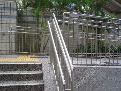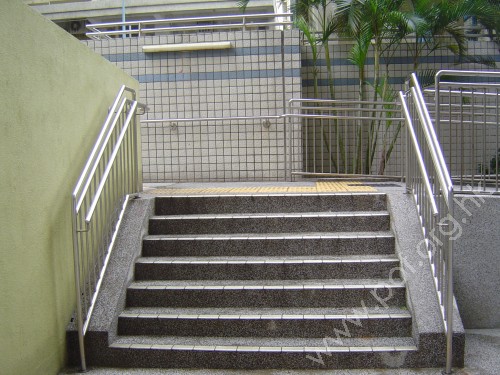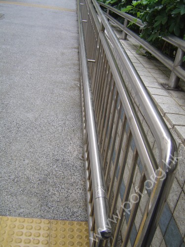 是金屬色圓條形,兩邊固定在兩邊矮牆上,扶手為有蓋天花支柱所阻,只頂端有平行地面伸延設計,底端無,無觸覺點字或凸字資料.