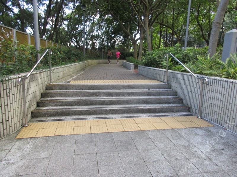 斜道與梯級並排而設,寬闊,斜度一般,兩邊設有欄杆形扶手固定在踏板上,欄杆旁無牆壁,頂底兩端設有黃色觸覺警告帶。