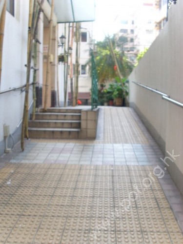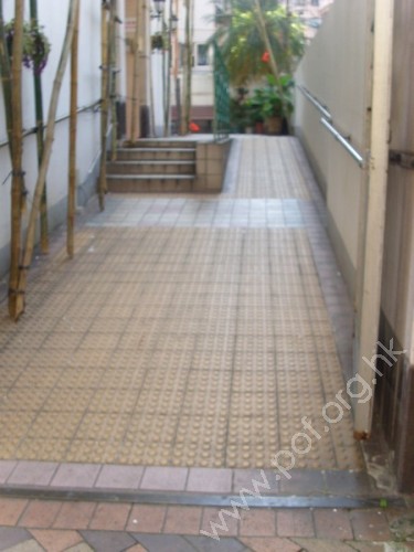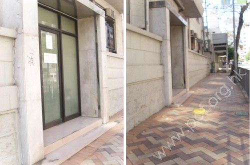 通道寬闊,入口前有梯級及斜道,設有兩扇木框玻璃門,無觸覺引路帶。
