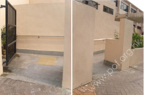 通道寬闊,入口設有一扇黑色鐵閘,閘內是斜道設計,無觸覺引路帶。