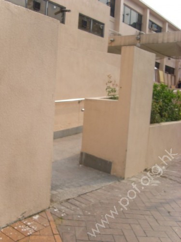 不銹鋼管狀設計,固定在圍牆上,直徑闊及高度適中,底頂有平行地面伸延設計,而且中段平面扶手無間斷,無觸覺點字或凸字資料。