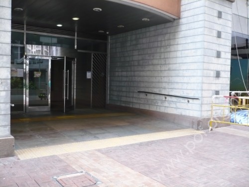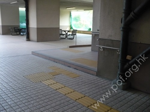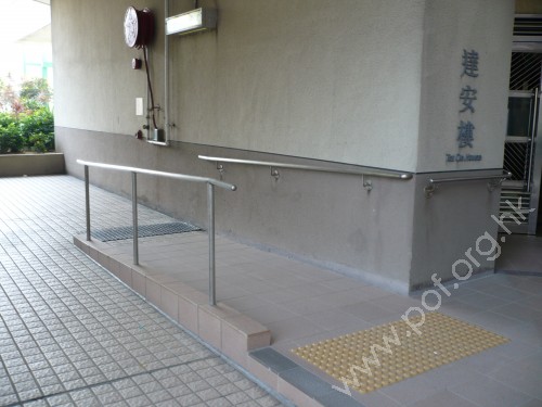 通道連接往來商場及屋邨各座住宅的4樓平台行人通道,是寬闊無障礙的住宅平台出入口閘門,前臨一級台階,旁設斜道連接平台行人路,台階前設有黃色觸覺引路徑,伸延一格轉向,沿平台行人路伸延至達貴樓、達顯樓、達佳樓、達信樓、達喜樓及商場,閘門是不綉鋼框架對開閘門,門旁密碼輸入器設有凸字資料標誌,閘門前兩邊設有扶手。