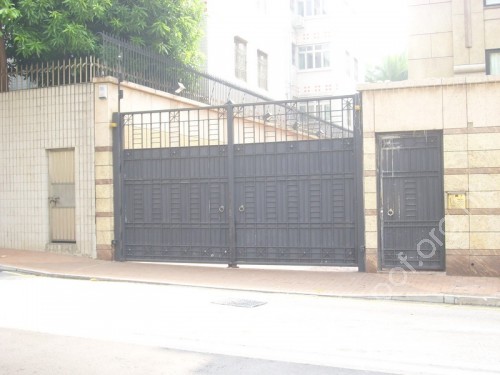 通道並排有兩個,一個是行人出入口,設有一扇黑色密碼鐵閘,旁邊有密碼按鈕,另一個是汽車出入口,設有兩扇黑色大電動鐵閘,閘前有下斜路緣,無觸覺引路帶。