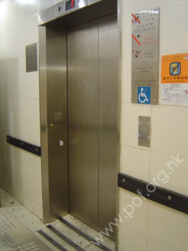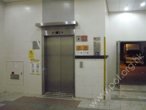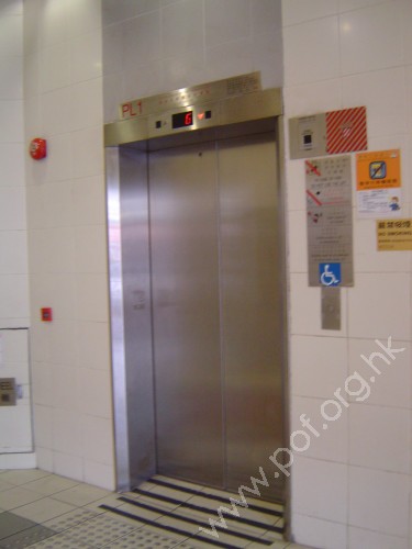 連接商場LG1層,地面層及平台層,是載貨及客運升降機,門旁設有白色圖案藍色底色國際暢通易達標誌,標示是無障礙通道,吊廂內三邊設有扶手,按鈕有點字及觸覺記號,但無顏色對比,緊急警號按鈕是黃色鐘形觸覺標誌,星形觸覺標誌位於地面層按鈕,設有視像指示器及對講機,關門有聲響提示,設有中英三種語言廣播.