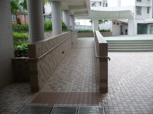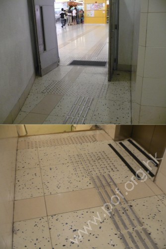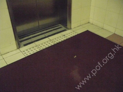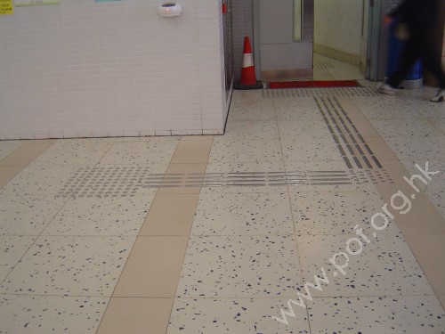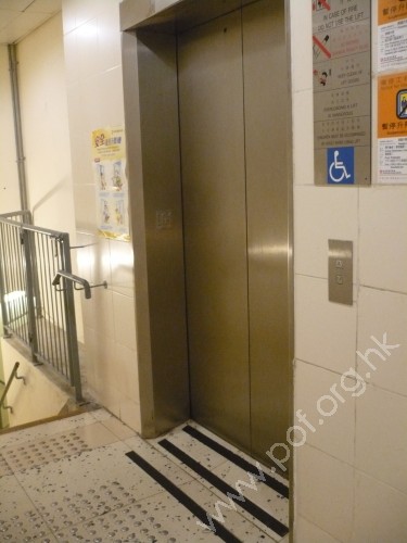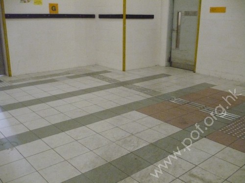 升降機前設有金屬色觸覺警告帶,連接同色引路徑向前伸延,轉向沿行人路至往來屋邨的出入口前警告帶止,轉向位置設有同色警告磚提示.
