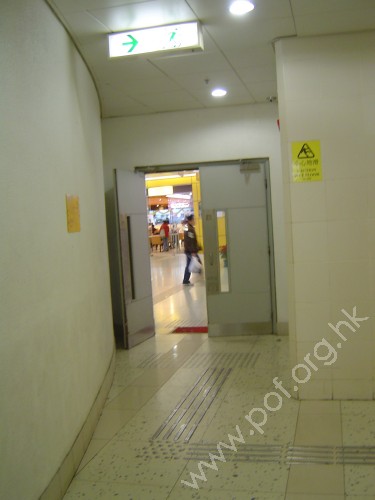 升降機前設有金屬色觸覺警告帶,連接同色引路徑橫向伸延,轉向伸延至商場LG1室內出入口前警告帶止,對應出入口另一邊引路徑往商場伸延,轉向位置設有同色警告磚提示.