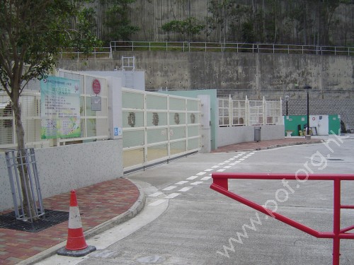 連接屋邨汽車路,通道是寬闊平坦無障礙的學校汽車出入口閘門,往來學校校舍建築物,兩邊行人路無觸覺引路徑,閘門是米白色金屬框架鐵網大閘門.