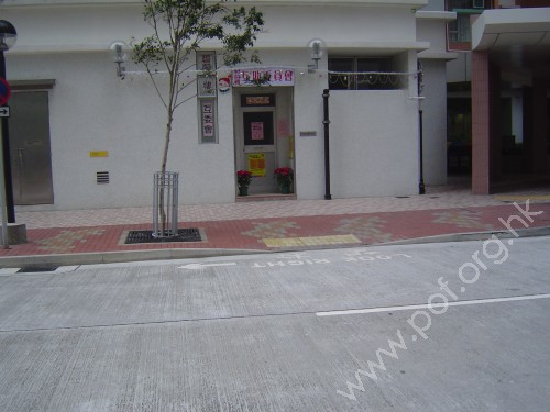 連接屋邨汽車路旁行人路,通道是一扇門闊度的互助委員會正門,前有一級台階障礙,無設斜道輔助,無觸覺引路徑,門是鋁質玻璃單邊推門.