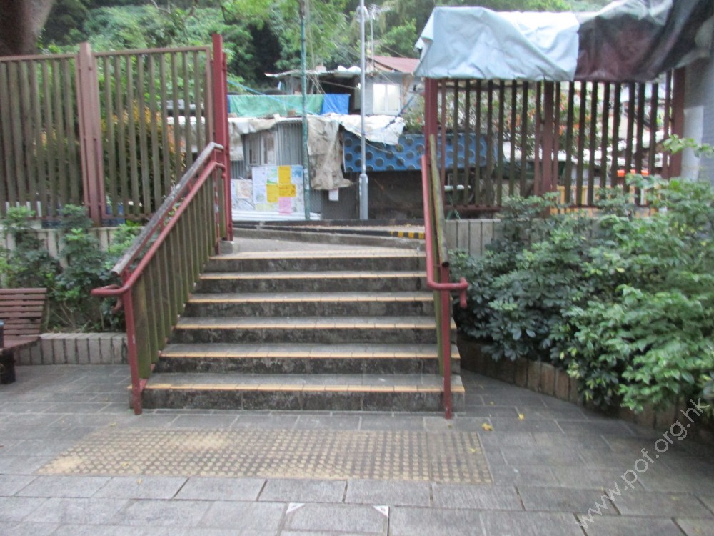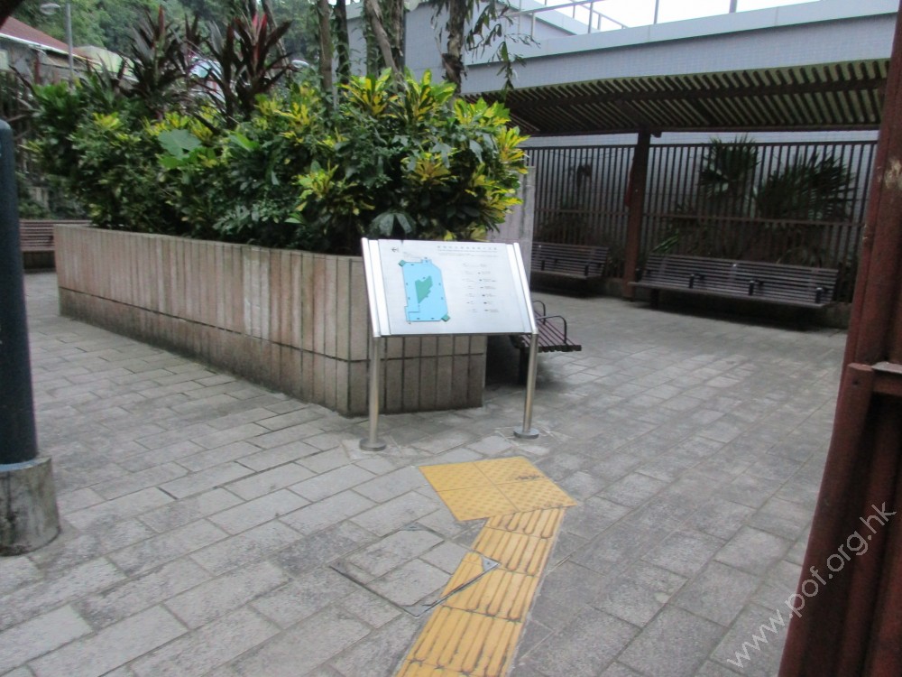 連接與住宅樓宇之間的行人路,通道寬闊,出入口設有一扇金屬閘門,門前有一級台階障礙,無斜道輔助。有一條觸覺引路帶,由門內引至觸覺點字及凸字地圖前。