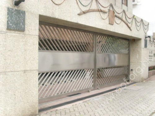 通道寬闊,與人行道接駁處微斜,門口設有兩扇不銹鋼電動閘,無觸覺引路帶。