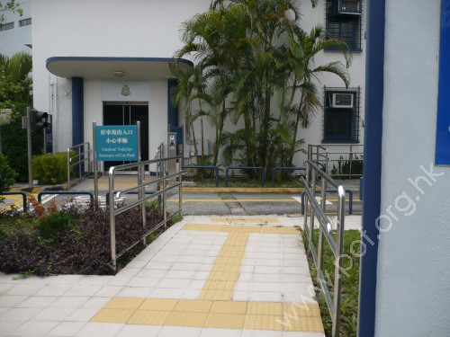 連接警署內汽車路,通道是寬闊平坦無障礙的報案室正門,前設斜道連接汽車路,無觸覺引路徑,門是茶色玻璃門.