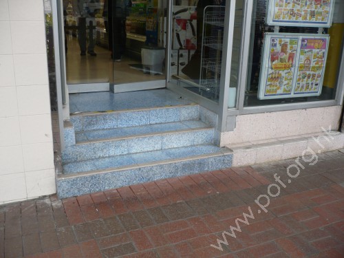 連接汽車路旁行人路與超級市場入口高低位置,共有三級踏板,頂底兩端無觸覺警告帶,兩邊是玻璃幕牆無扶手.