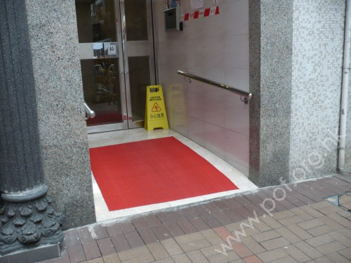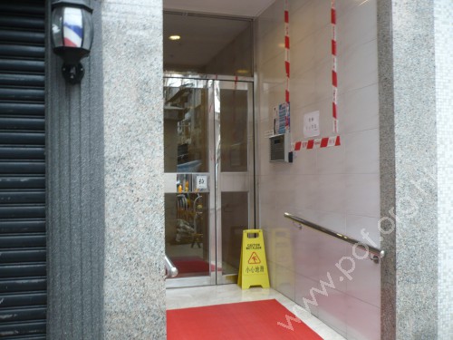 連接與住宅樓宇之間行人路,通道是寬闊無障礙的住宅正門,門前設有斜道連接行人路,無觸覺引路徑,門是不綉鋼框玻璃對開推門.