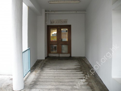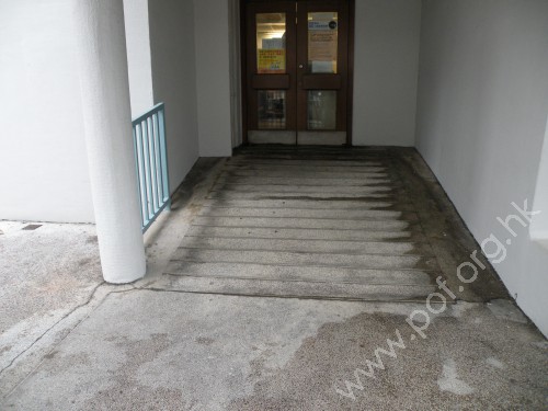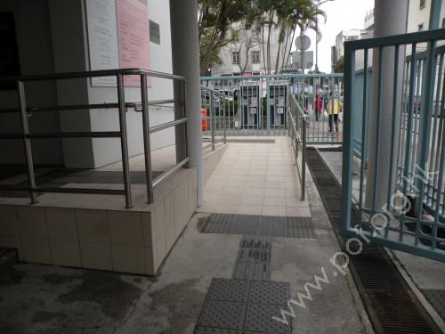 連接汽車路與旁行人路,通道是寬闊平坦無障礙的汽車出入口,進入後一邊是診所汽車出入口閘門,往來診所範圍內建築物,向前是西貢政府合署停車場汽車出入口,出入口前設有下斜路緣連接汽車路,兩旁行人路無觸覺引路徑.
