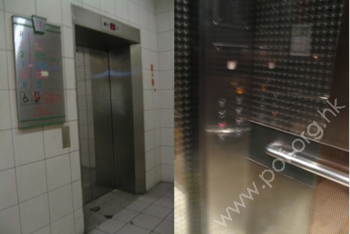 並排兩部升降機,連接地面與2樓及3樓,有暢通易達標誌.吊箱空間寬闊,內外有視像顯示,吊箱內三邊設有扶手但相連,按鈕有觸覺點字,開/關門時有聲訊提示,有兩種語音提示,地面層鋪有觸覺引路徑引導至升降機前.