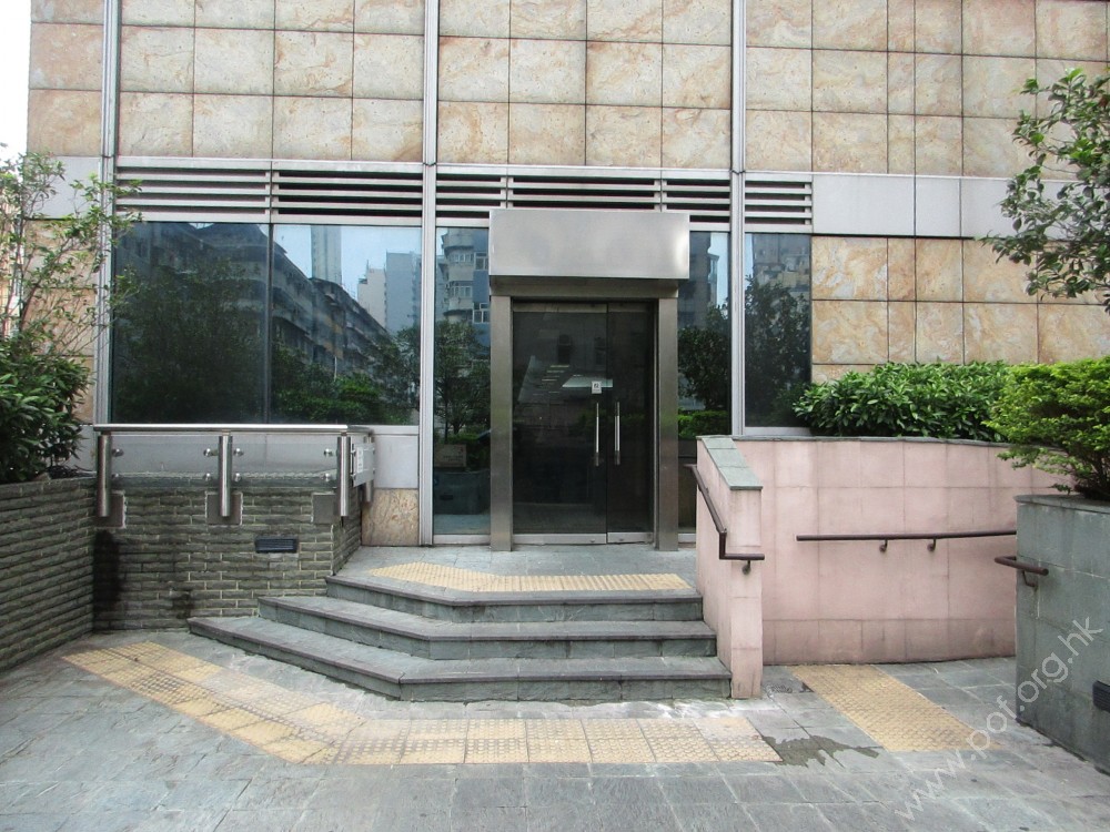 通道寬闊,出入口前設有三級梯級,旁邊有斜道輔助;出入口處設有兩扇玻璃推拉門,大細門設計,無觸覺引路帶。