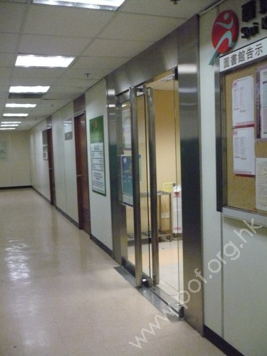 連接往來大樓1號,2號及3號升降機前大堂及行人通道的室內出入口及走廊通道,通道是寬闊平坦無障礙的圖書館出口,門前無引路徑,門後設有一段黃色觸覺引路徑,伸延至借書處,門是玻璃對開推門.