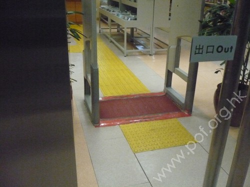 出口內設有黃色觸覺警告磚,連接一段同色引路徑,連接借書處,引路徑是兩條並排.