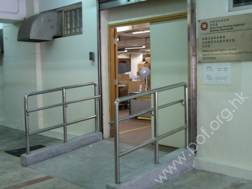 通道寬闊,門前是一斜道,斜度不大,兩旁設有不銹鋼管狀扶手,門口設有兩扇木門,無觸覺引路帶。