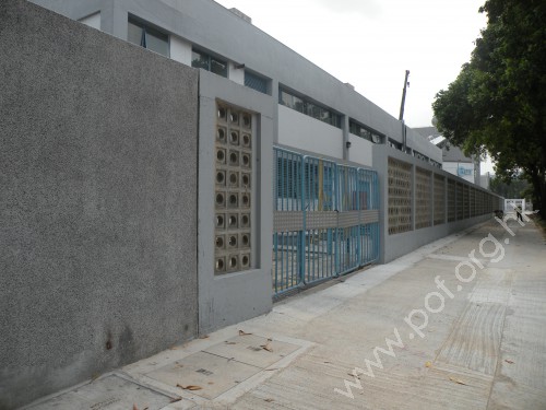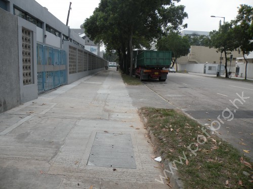通道是寬闊平坦無障礙的汽車出入口閘門,前設下斜路緣連接汽車路,橫過出入口的行人路無觸覺引路徑,閘門是藍色金屬框架大閘門.
